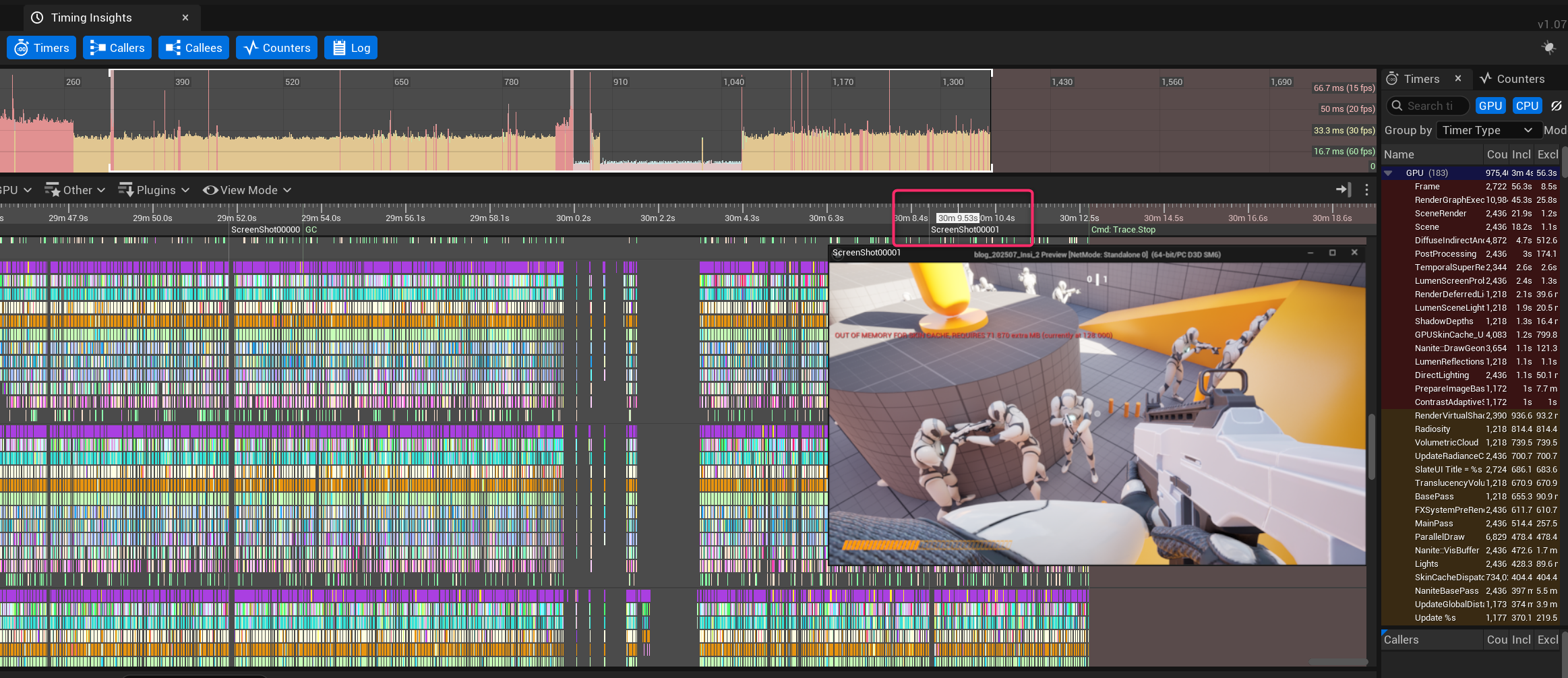 撮影したスクリーンショットはデータをUnrealInsightsで開くことで確認できます。