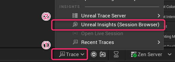 Trace > Unreal Insights (Session Browser) からUnrealInsightsを起動します。
