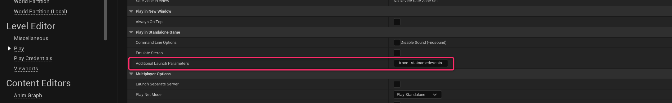 Editor Preferences > Level Editor > Play > Play in Standalone Game > Additional Launch Parameters に、以下の計測設定のコマンドを入力します。