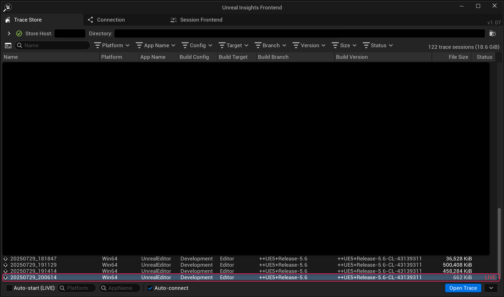 実行後、UnrealInsightsの画面に【LIVE】と表記されたセッションが追加されていたら成功です!