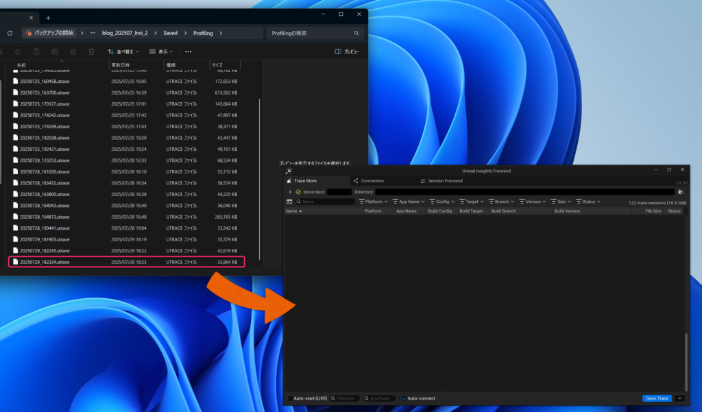 その場合、Trace > Open Profiling Directory で開かれたフォルダの中から上記のName命名規則を参考にプロファイルデータ(.utrace)を探し、それをUnrealInsightsにドラッグアンドドロップします。