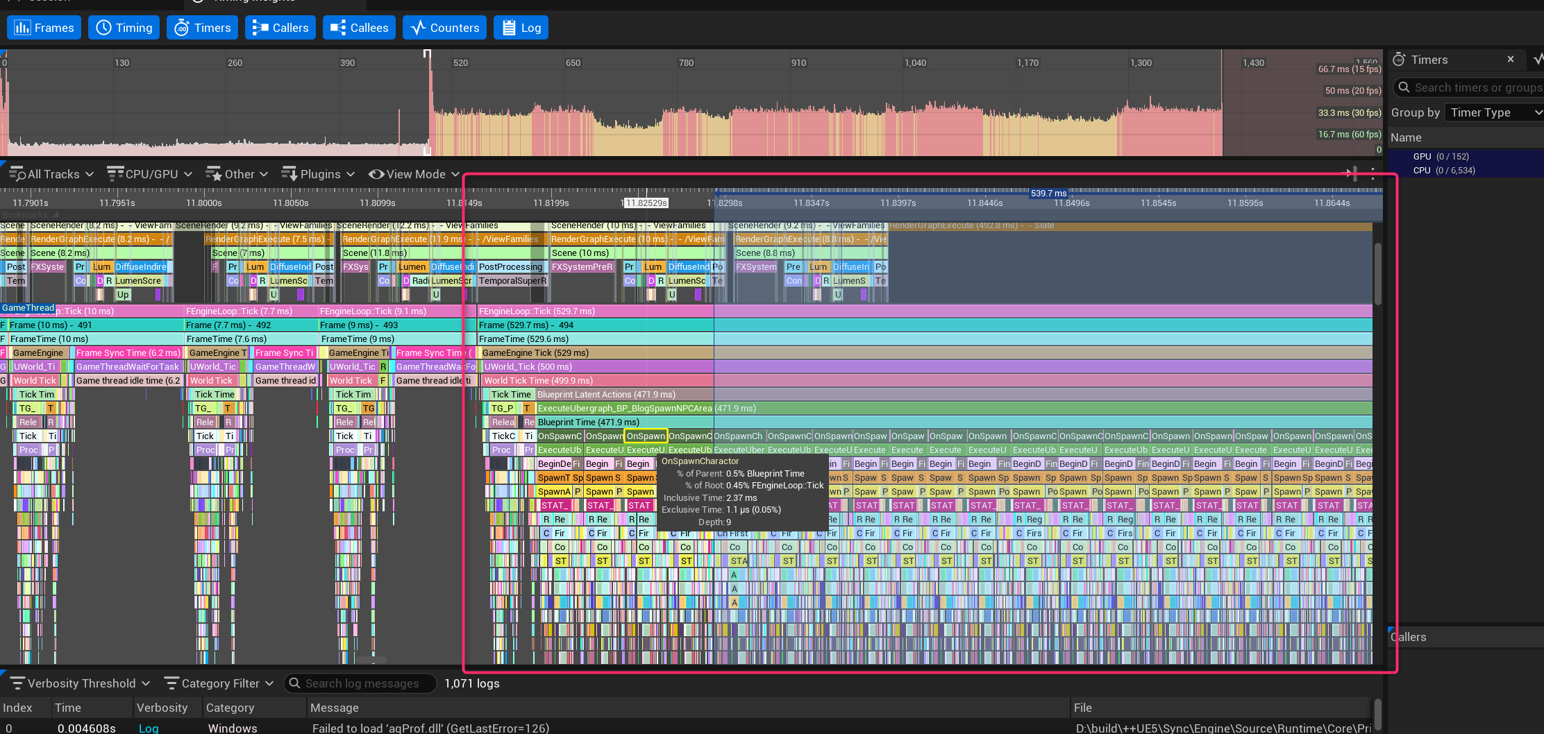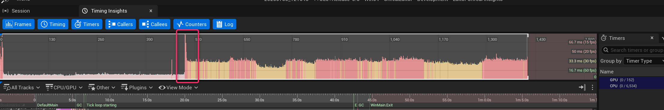 実行終了後、UnrealInsights上で該当のセッションを開くことで、プロファイリング結果を見ることができます!