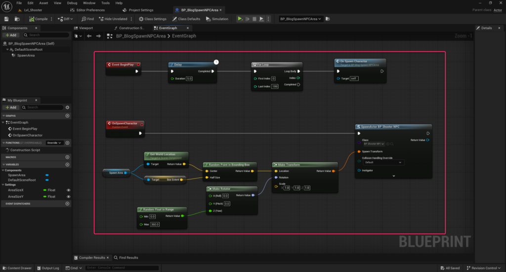 内容は簡単、新しくActorを作り(命名:BP_BlogSpawnNPCArea)BeginPlayにてゲーム開始5秒後にBP_ShooterNPCをランダムな位置にスポーンさせる処理を書きます。