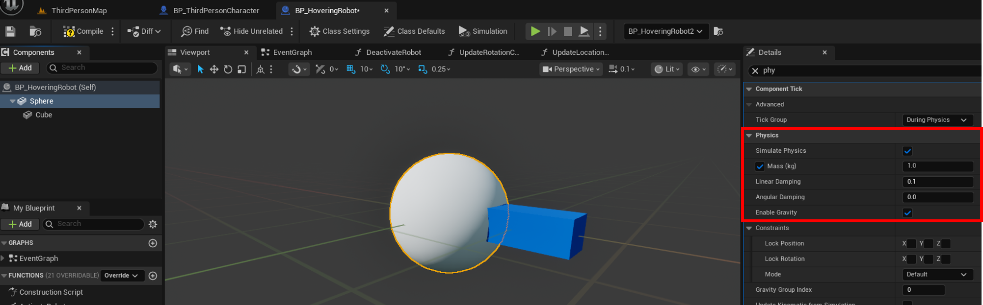 ロボットに近づくとHoveringDestination x の位置にロボットがふよふよ漂い、Pボタンを押すとロボットが再び地面に転げ落ちます。CoolDown時間を過ぎるとまたロボットを再取得できます。