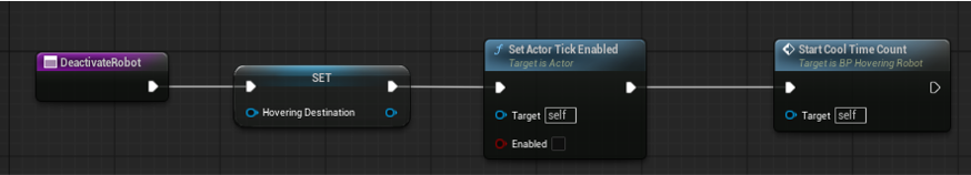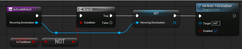 ロボットを起動するActivate関数を追加後、以下のよう編集します。SceneComponent型の変数:HoveringDestinationとbool型の変数:bInCooldownを追加しています。