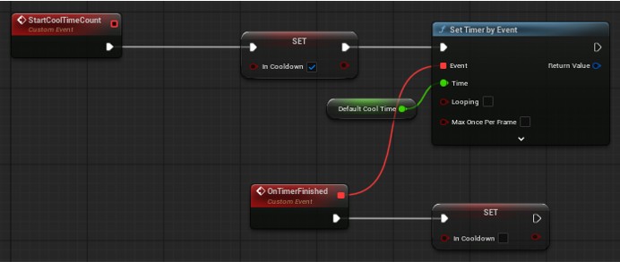 次にDeactivate関数を追加後、以下のよう編集します。StartCoolTimeCountイベント関数はEventGraphにて実装しました。クールダウン時間間隔を表すfloat型の変数:DefaultCoolTimeを追加しています。