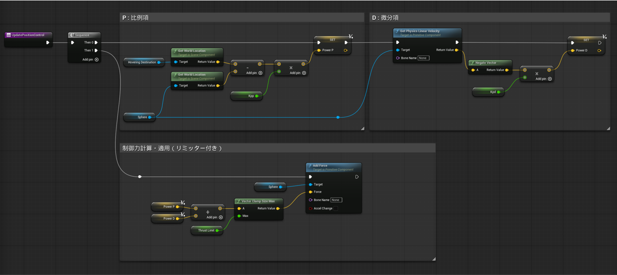 基本的に(1)’式の通りに計算しており、変数:Kpp = (100.0位)、変数:Kpd =(25.0位)としています。ただし、制御力(推力)にリミッターをかけています。今回はロボットの加速度上限を、重力加速度の5倍程度にしたいと思ったので、980(cm/s^2) x 5 x ロボット質量の1 (kg) = 4900 (cN )の値を変数:ThrustLimitに設定しています。