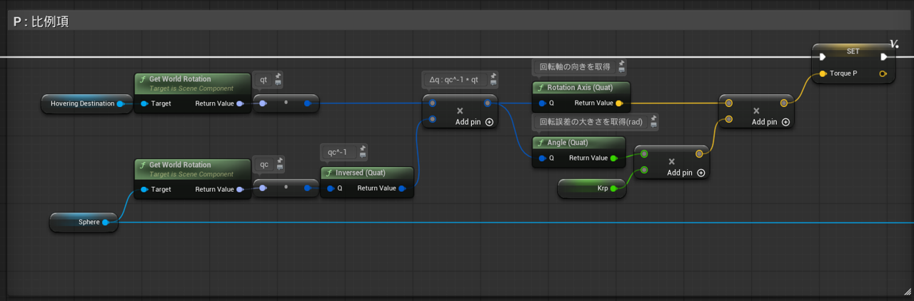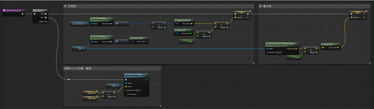 変数:Krp = (5.0位)、変数:Krd = (1.0位)としています。トルクに関しては特にリミットを設けませんでした。最後に計算した値を加算後、SphereにAdd Torque in Radiansしています。これによりSphere原点で計算したトルクを作用できます。