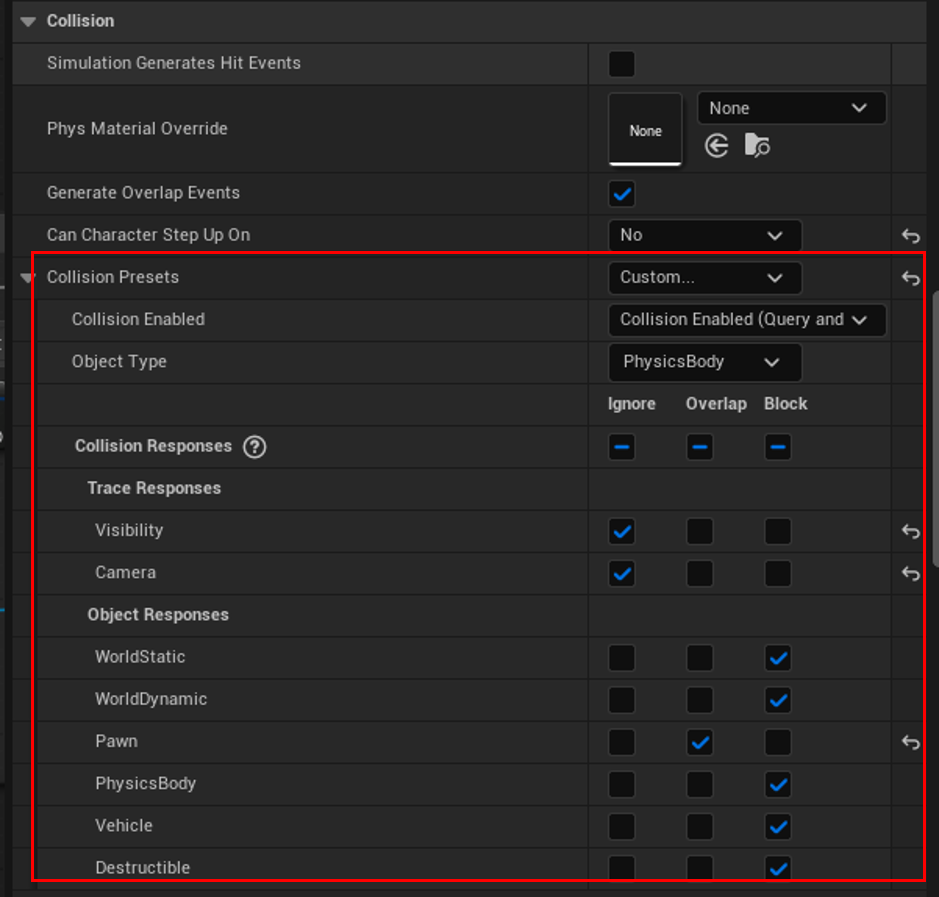 また、プレイヤーのカプセルコンポーネントとは衝突しないよう、Mesh(Sphere)コリジョンを画像のように設定しています。