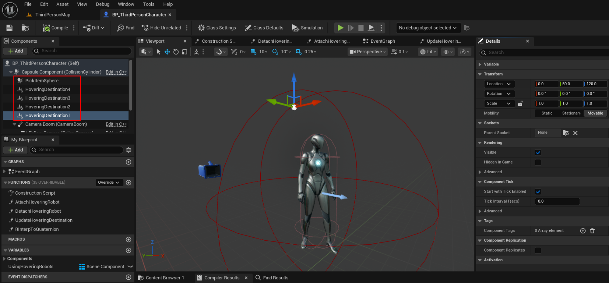 ① プレイヤーに浮遊ロボットをまとわせる目標座標を設けるため、今回はSceneComponent(画像のHoveringDestination x)を任意座標で四つほど追加しました。