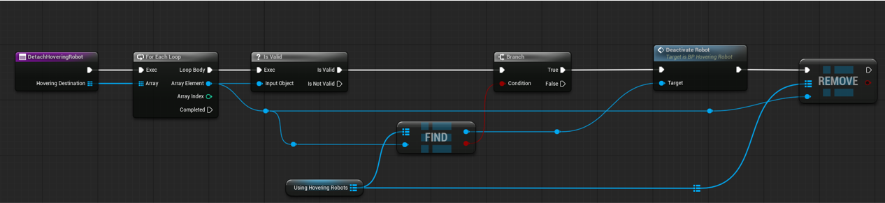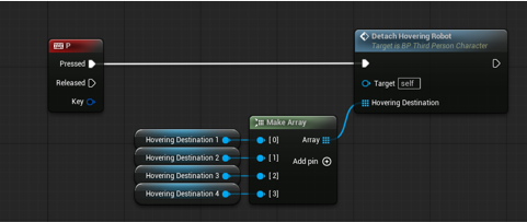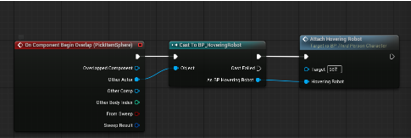 ロボットにプレイヤーが近づいた時に有効化する処理を実装します。まずPickItemSphere->Events->OnComponentBeginOverlapを有効化後、以下のように処理を組み、AttachHoveringRobot関数を追加します。