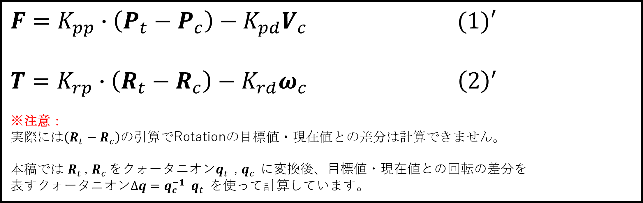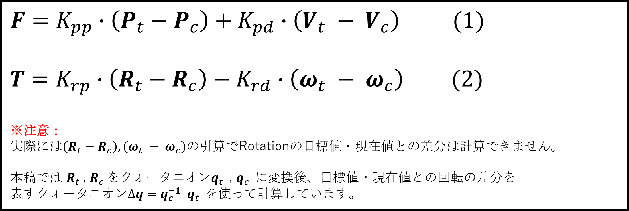 ロボットという重さのある物体を、目標とする位置と姿勢(Rotation)に動かすための力とトルク値を計算します。その方法として今回は古典制御のPD制御を利用する事とします。PD制御は「比例微分制御」の略で、目標値と現在値の差を使ってモノを滑らかに動かす制御手法の一つです。今回は以下の要件で使用します。