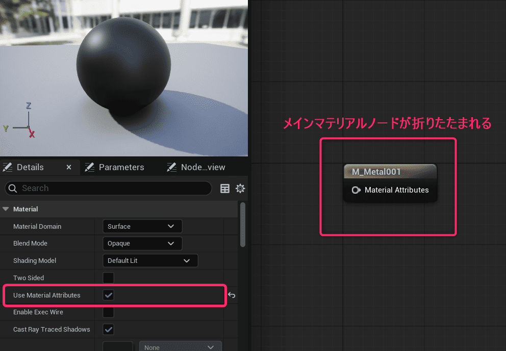 ・Detailsの☑Use Material Attributeをするとメインマテリアルノードが折りたたまれます。