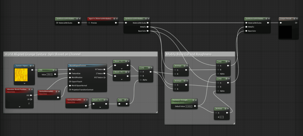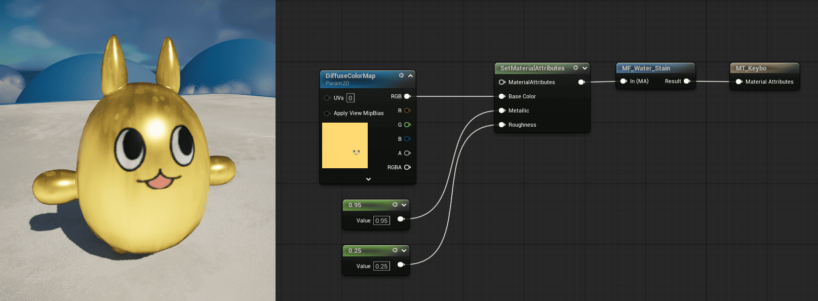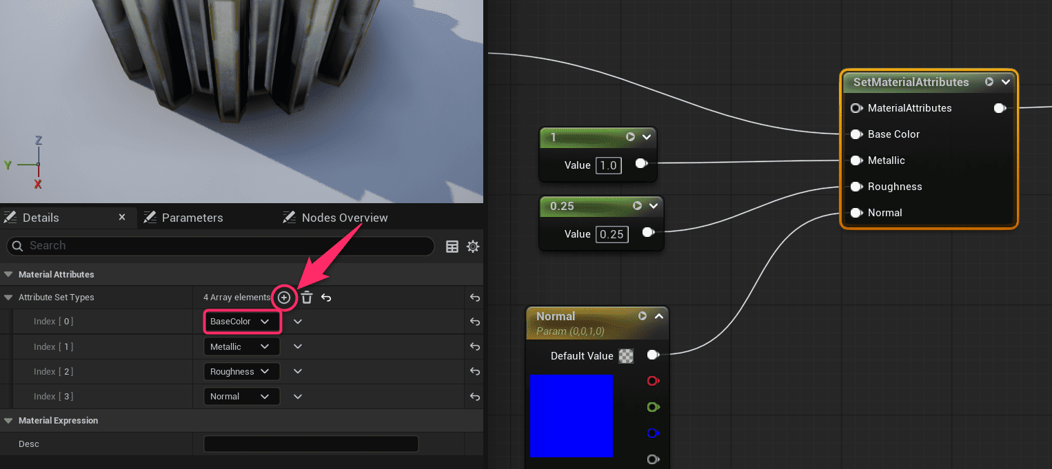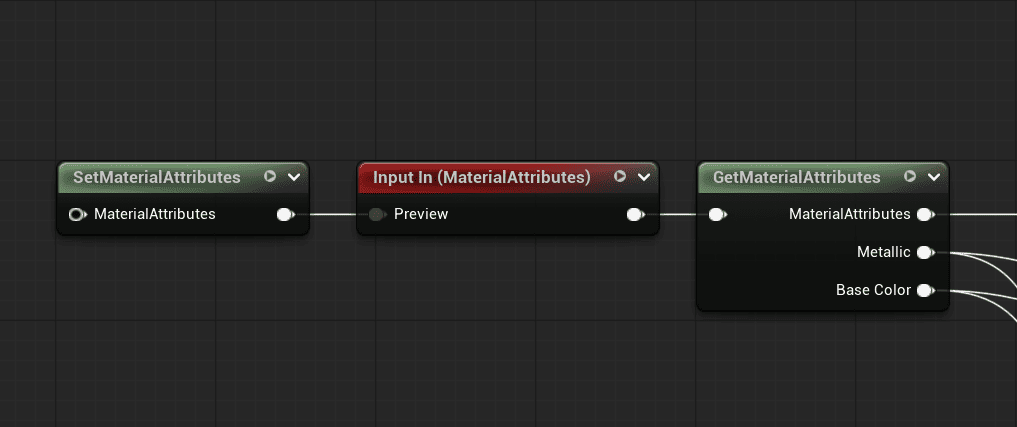 今回はMetallicとBaseColorを追加して選びます。変更しないものはMaterialAttributesを通して素通りするように設定します。