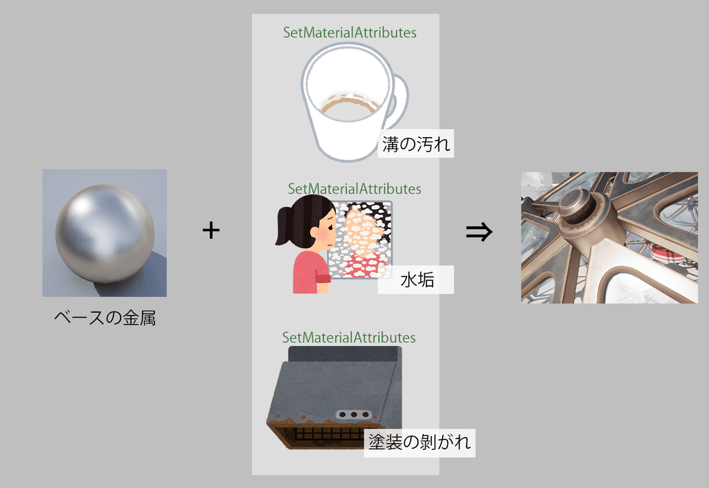 マテリアルの基本的な要素はそのままで、後から「エッジの塗装剥がれ」「溝の汚れ」といった機能を追加できるので、