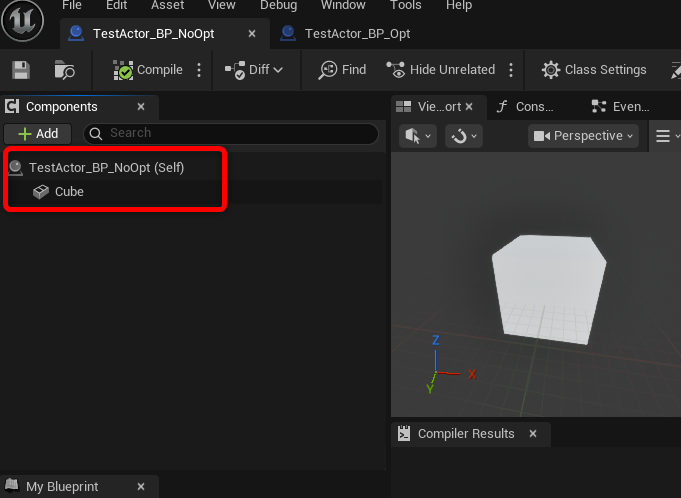 Generate Optimized Blueprint Component Data チェックなしを、TestActor_C_10_NoOpt。