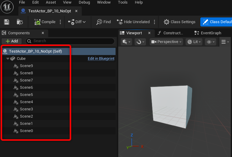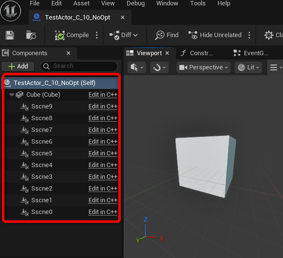 Generate Optimized Blueprint Component Data チェックなしを、TestActor_BP_10_NoOpt。