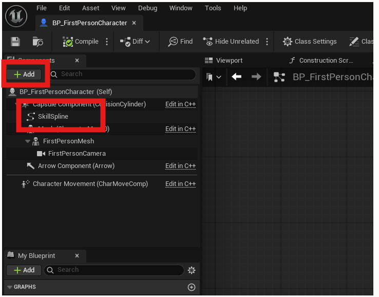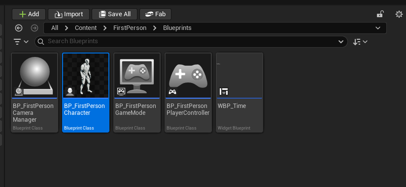 All>Game>FirstPerson>Blueprints 内の、BP_FirstPersonCharacterを開きます。