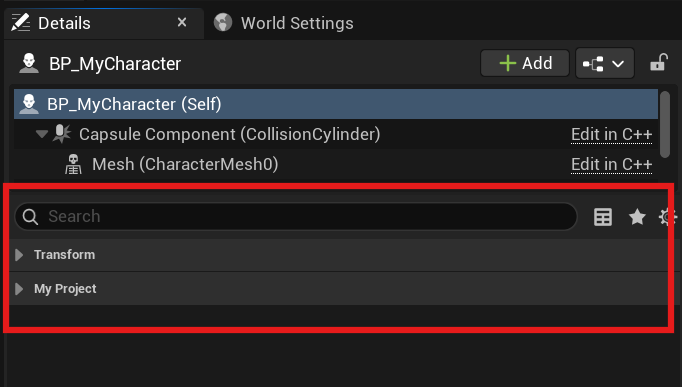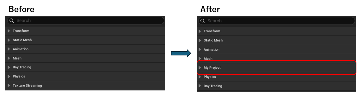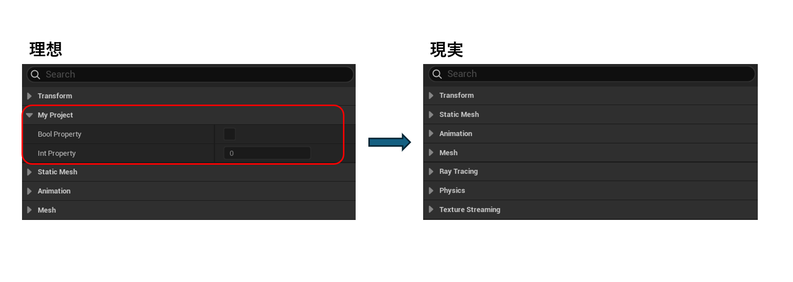 void FMyCharacterDetails::CustomizeDetails(IDetailLayoutBuilder& DetailLayout) { // Transformカテゴリの下になるようにPriorityを設定 DetailLayout.EditCategory(TEXT("MyProject"), FText::GetEmpty(), ECategoryPriority::Transform); } |