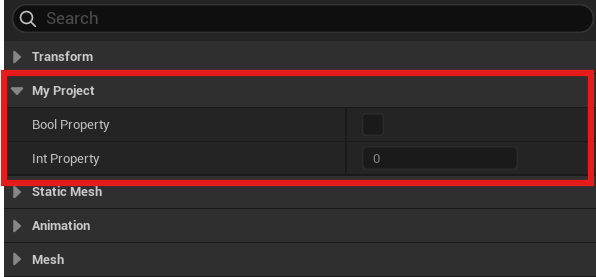 UCLASS() class MYPROJECT_API AMyCharacter : public ACharacter { GENERATED_BODY() public: UPROPERTY(VisibleAnywhere, Category = "MyProject") TObjectPtr StaticMeshComponent; UPROPERTY(EditAnywhere, BlueprintReadOnly, Category = "MyProject") bool bBoolProperty; UPROPERTY(EditAnywhere, BlueprintReadOnly, Category = "MyProject") int32 IntProperty; }; |
