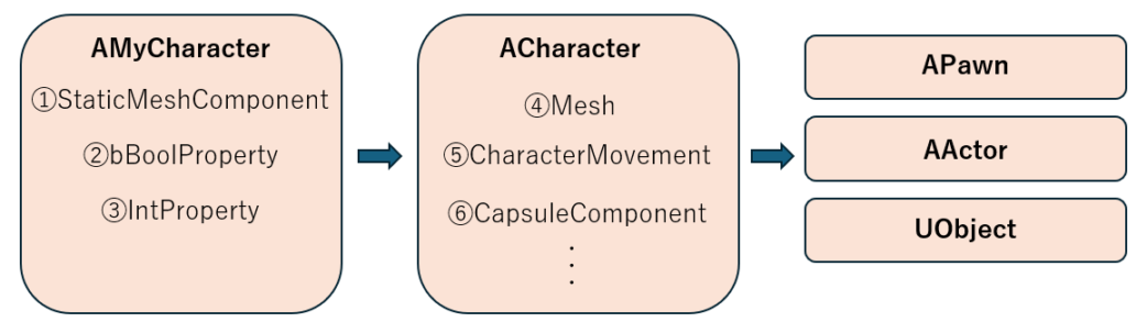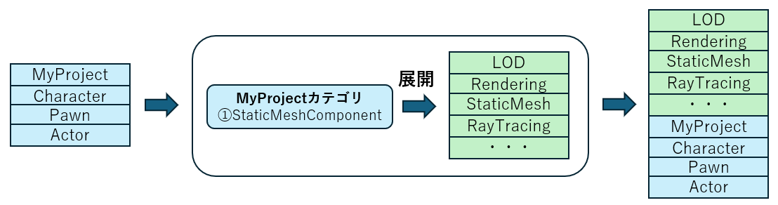 ①MyProjectカテゴリ ├─1.StaticMeshComponent ├─2.bBoolProperty ├─3.IntProperty ②Characterカテゴリ ├─1.Mesh ├─2.CharacterMovement ├─3.CapsuleComponent ・・・ |