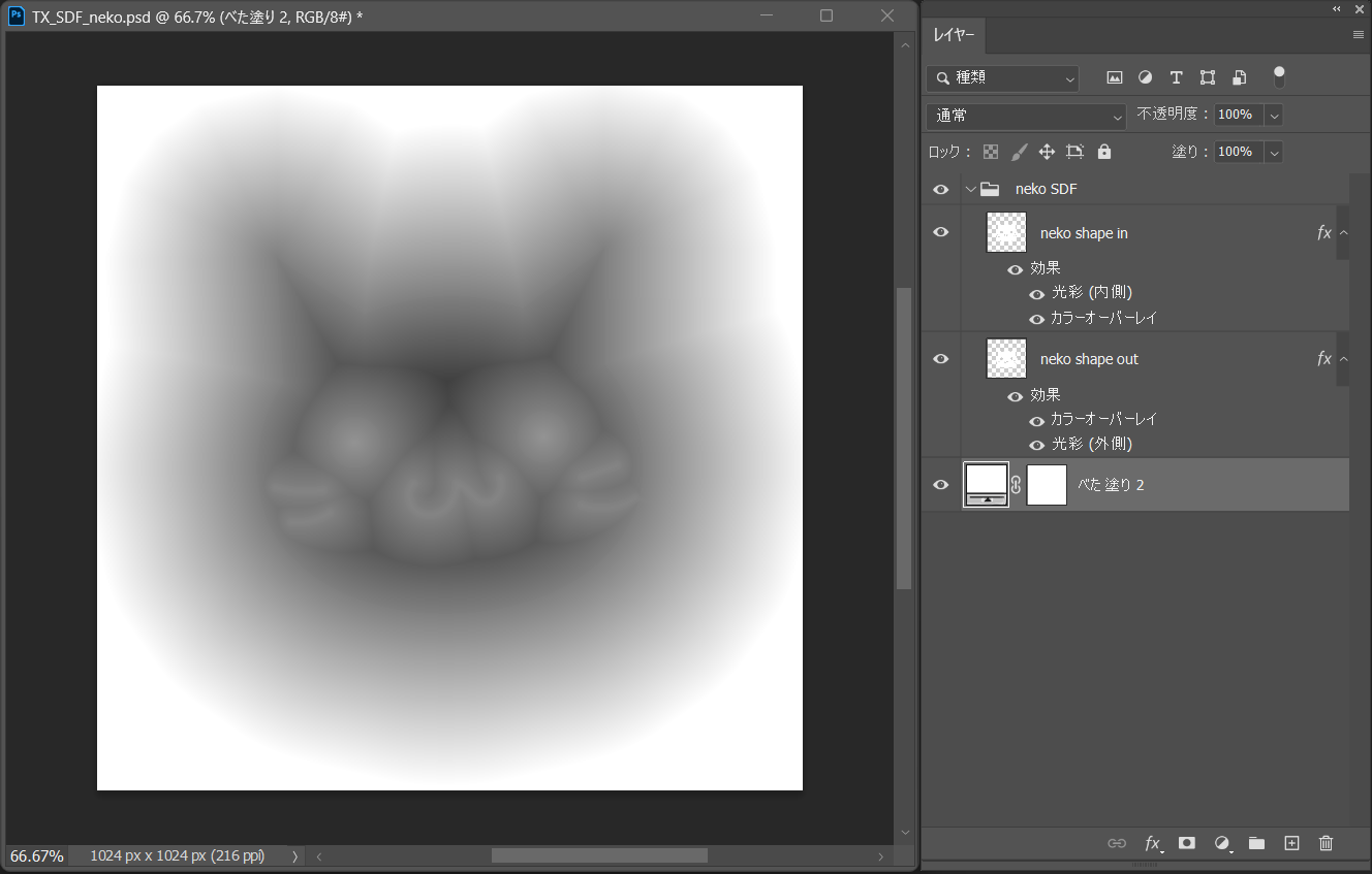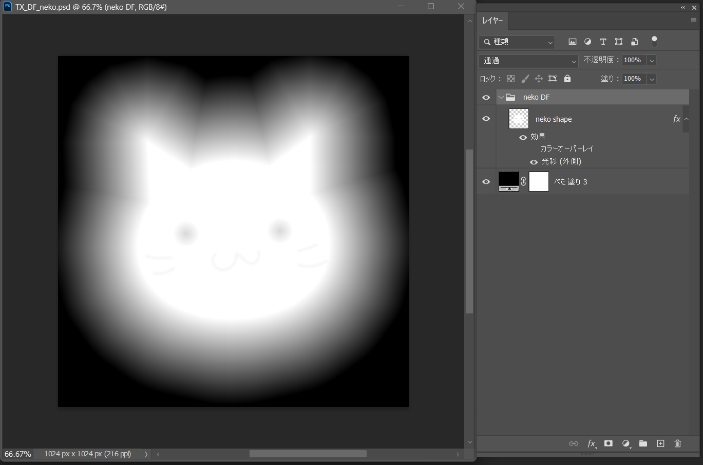 たとえば、Photoshopの効果で「光彩(外側)」を適用すると、明るさが輪郭からの距離を示すようになります。これが距離場(Distance Field)の基本的なイメージです。