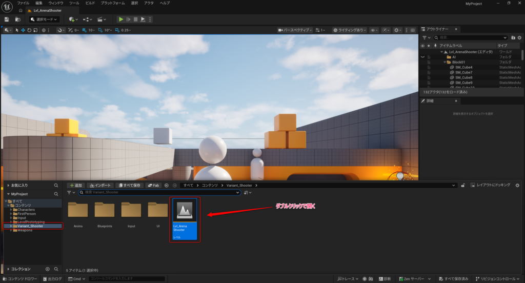 プロジェクトが開いたらアリーナ シューター用のレベルを開きましょう。
