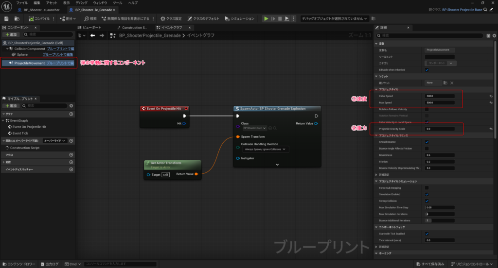 続いて弾側「BP_ShooterProjectile_Grenade」の設定です。