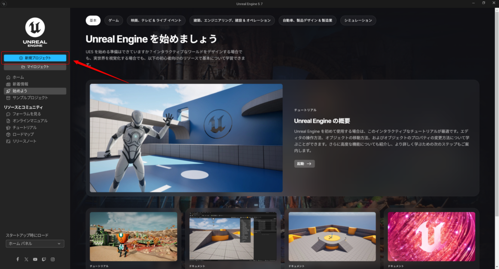 UE5.7を起動したらホームパネルが表示されるので、左上の「新規プロジェクト」を選択します。