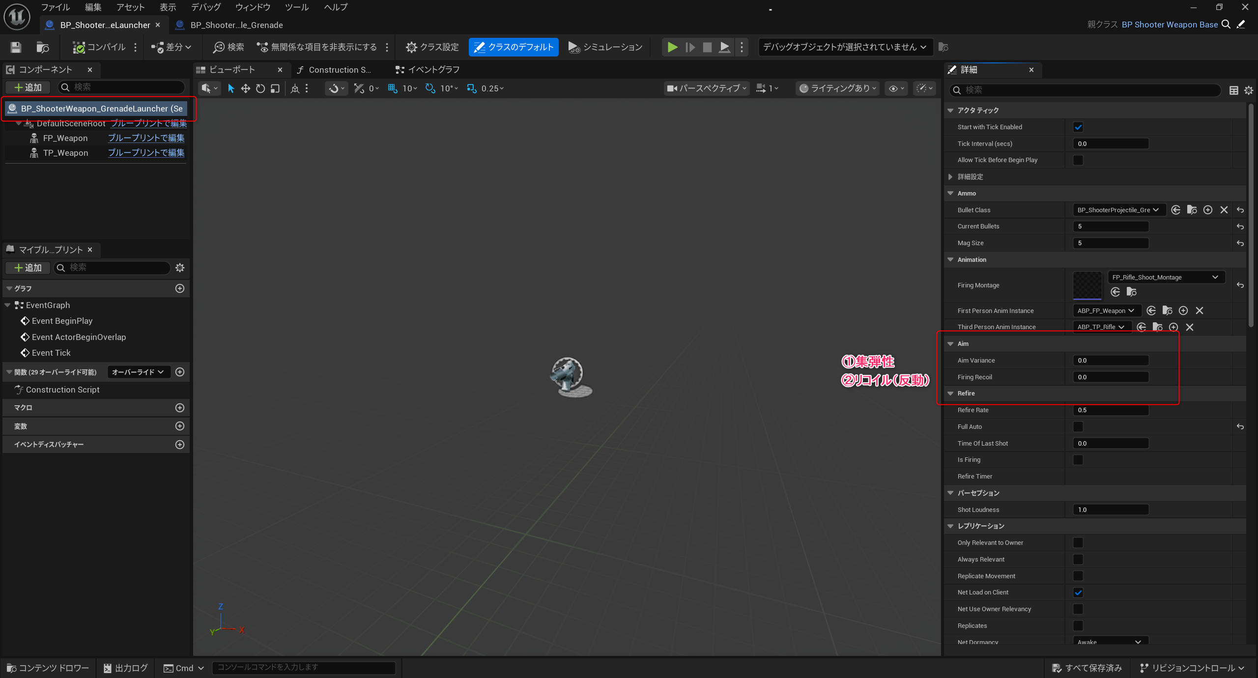まずは武器側「BP_ShooterWeapon_GrenadeLauncher」の設定です。