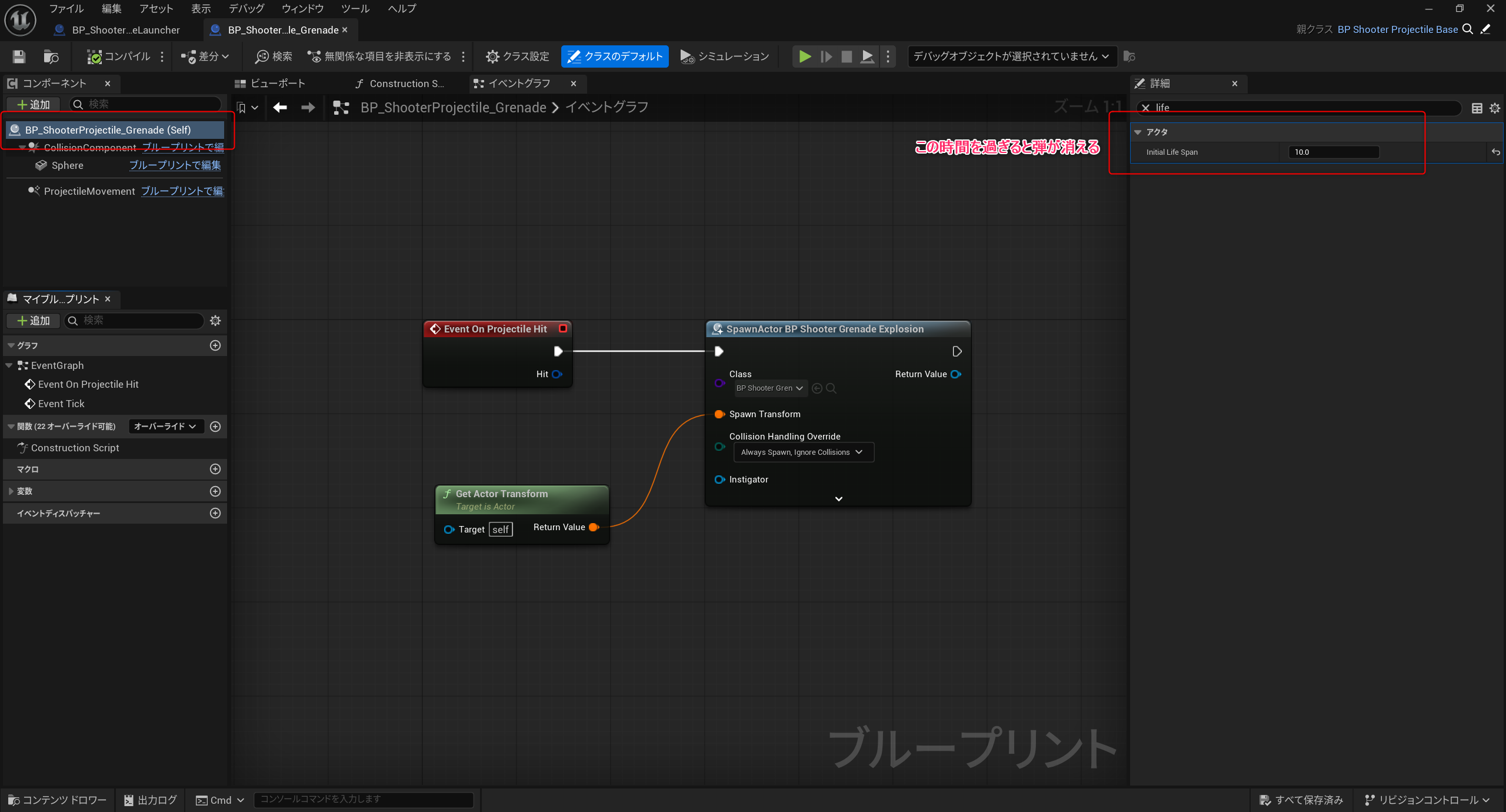 「BP_ShooterProjectile_Grenade」のイベントグラフを開き、下記の通り実装します。