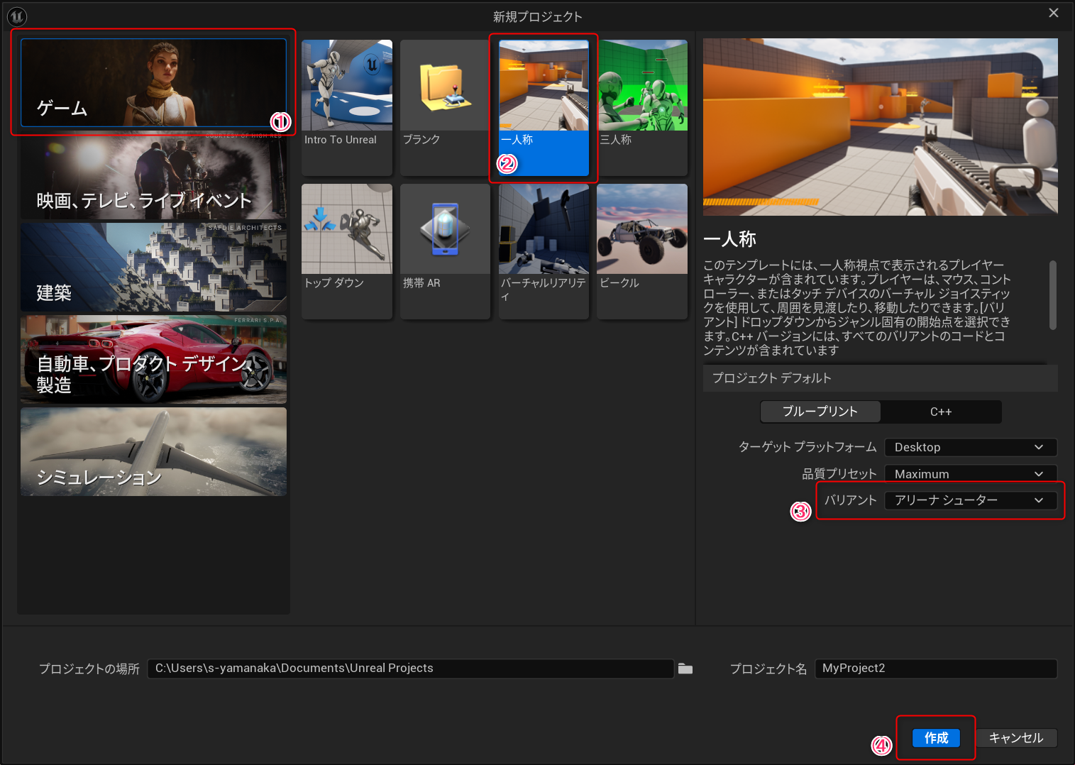 見慣れた画面が表示されたら「ゲーム」→「一人称」→「バリアント:アリーナ シューター」の順で選択していき