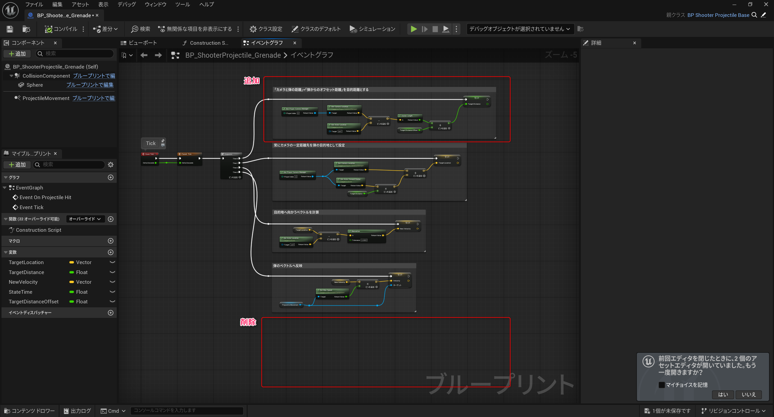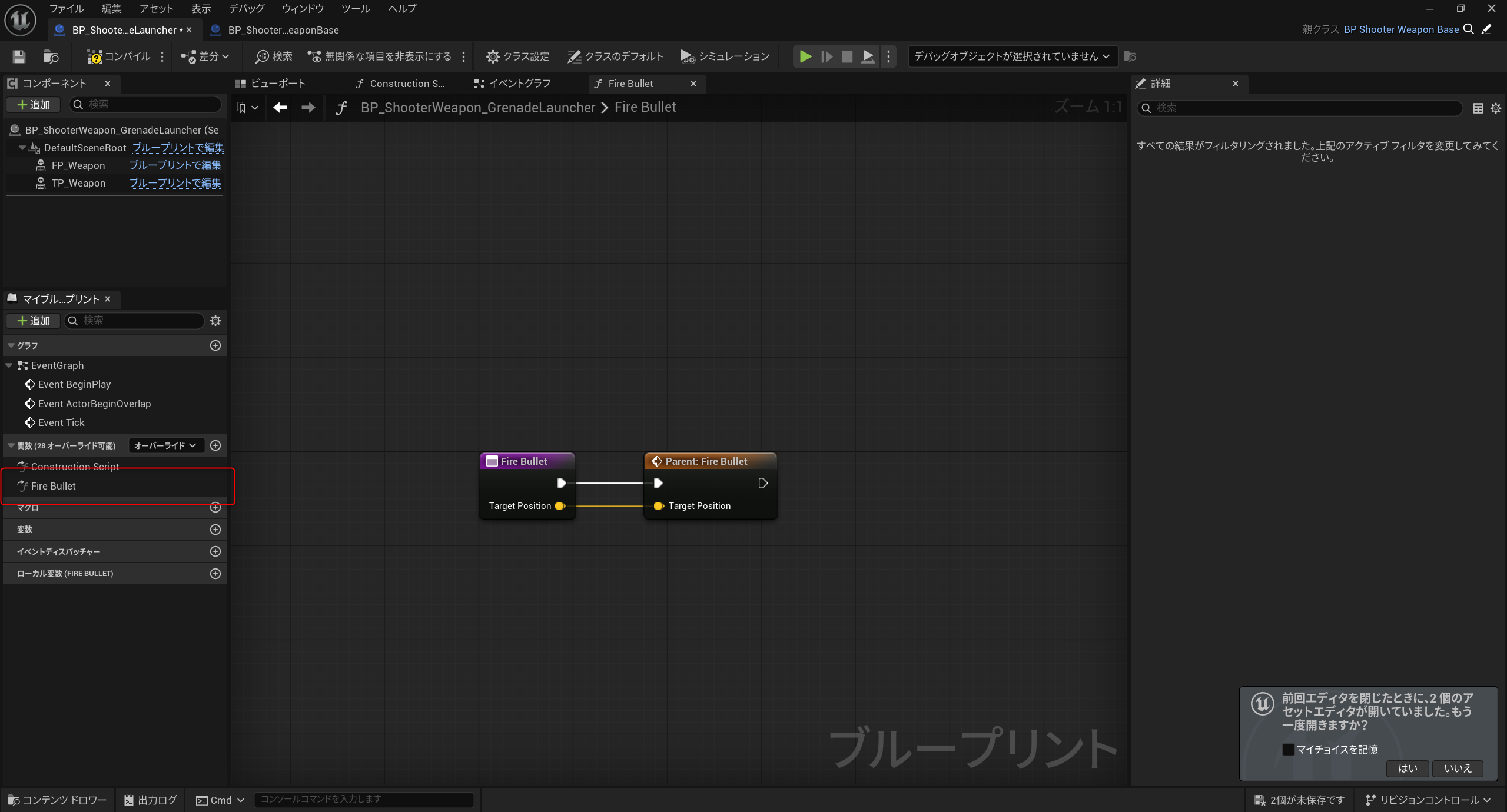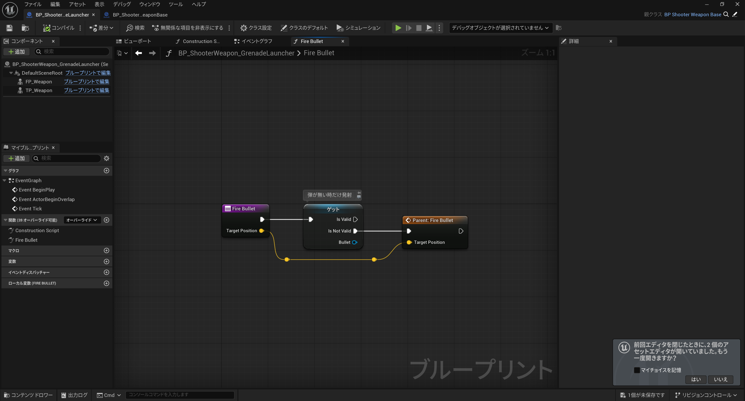 次にグレネードランチャーのブループリント「BP_ShooterWeapon_GrenadeLauncher」を開きます。