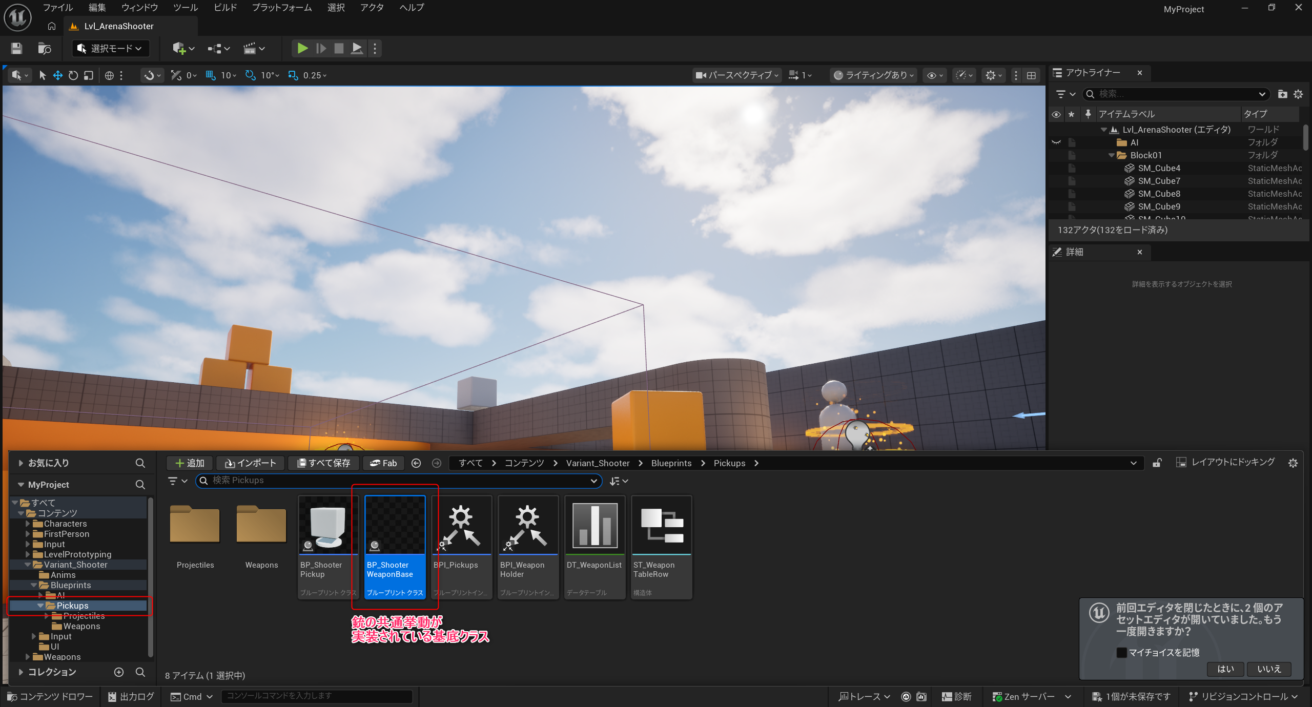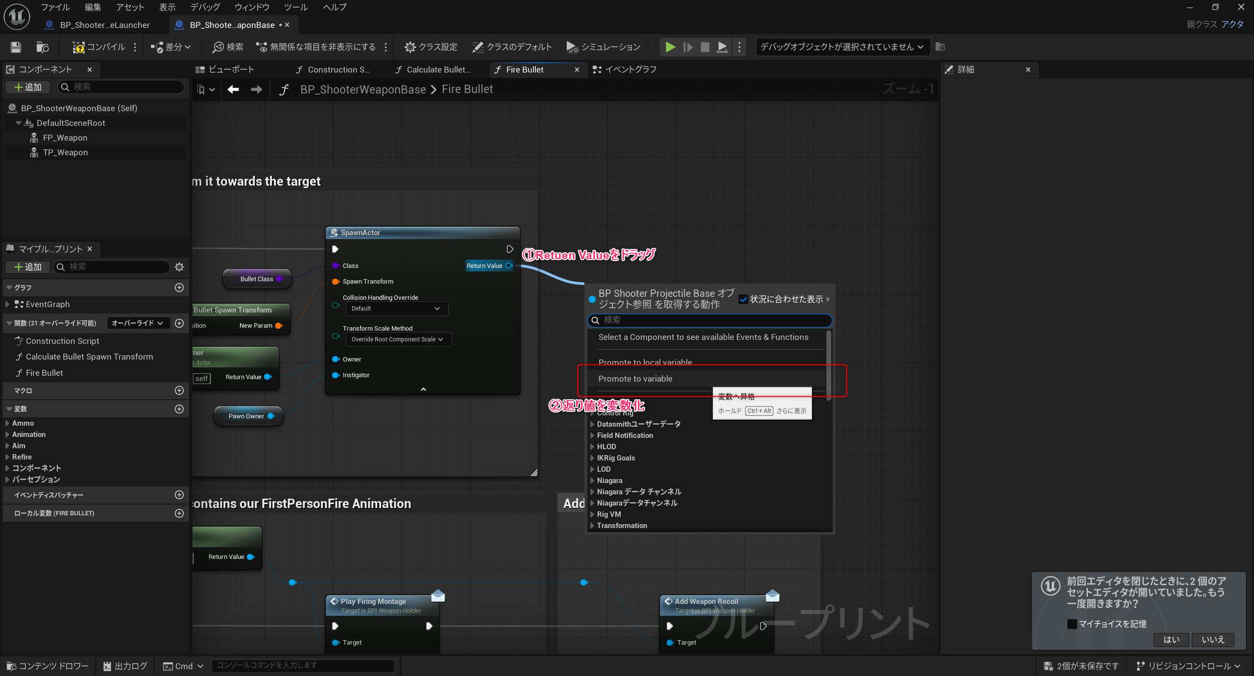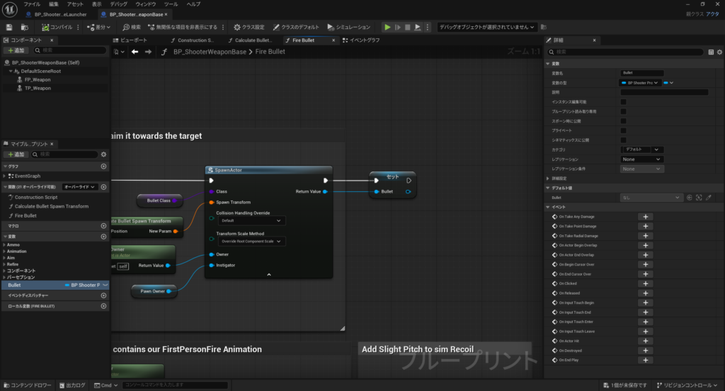 まずは発射した弾の参照を持つ必要がある為、銃の基底クラスのブループリント「BP_ShooterWeaponBase」に処理を追加します。