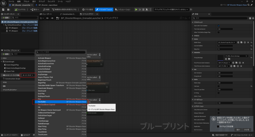 イベントグラフを開いたら下記の通り、弾を発射する際の関数「FireBullet」をオーバーライドします。