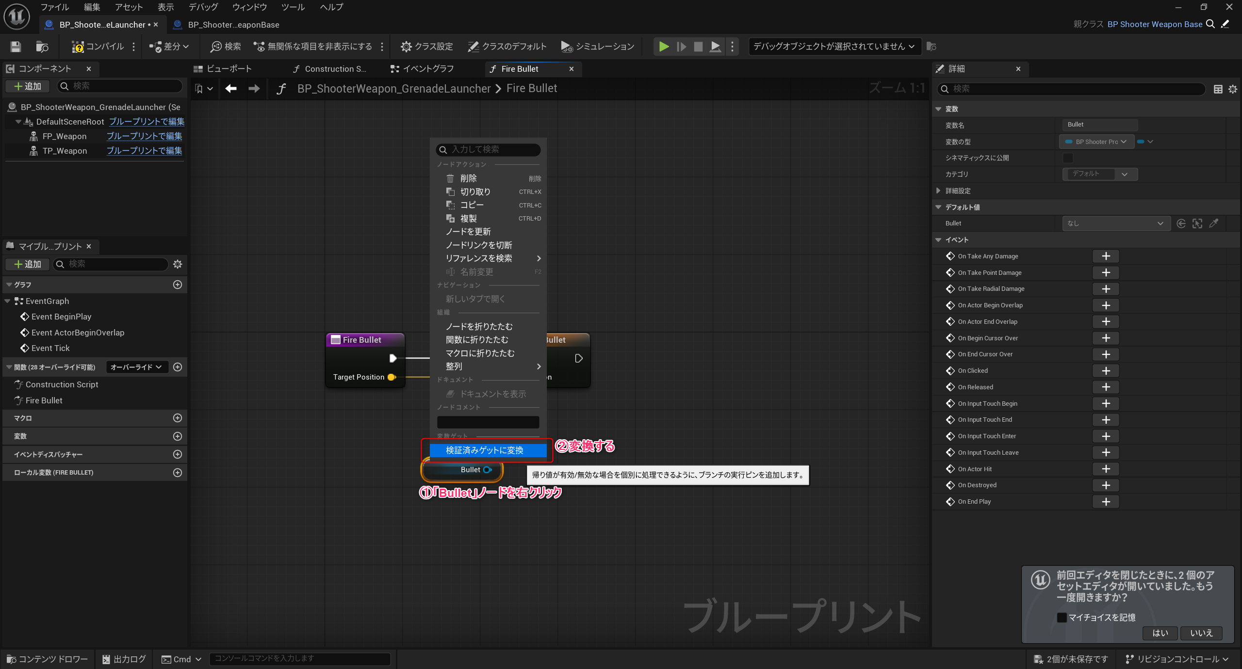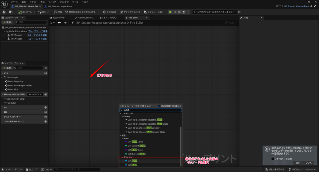 まずは基底クラスに追加した「Bullet」変数のGetノードを作成します。