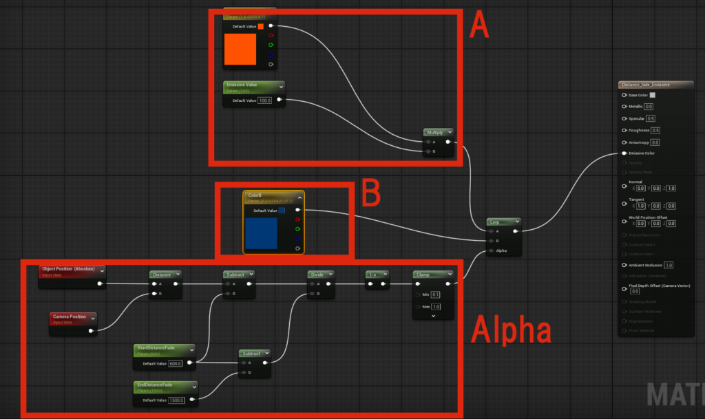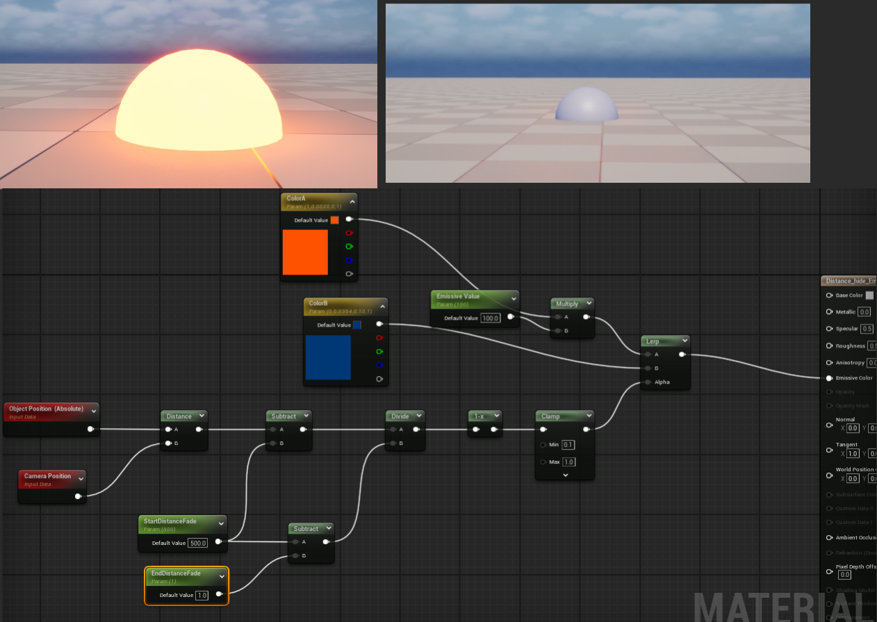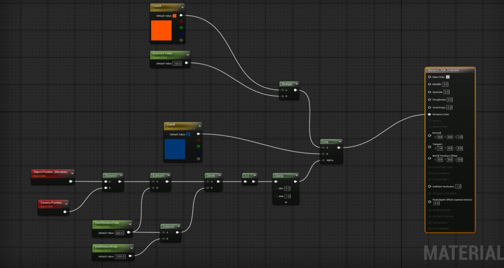 Lerp ノードを使用して、距離に応じてマテリアルの色を切り替えます。