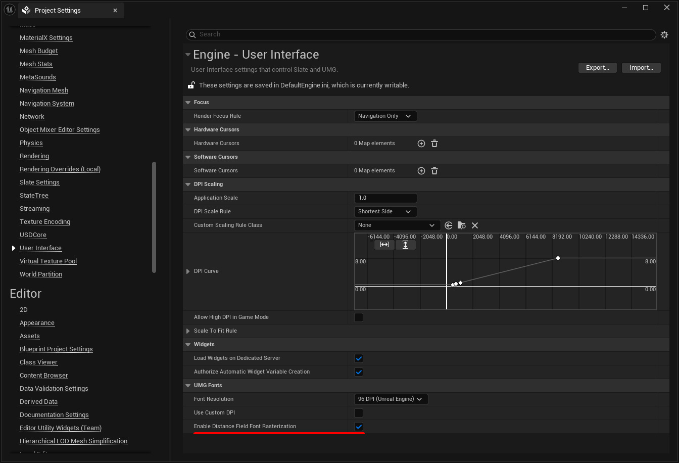 Project Settings > Engine > User InterfaceのEnable Distance Field Font Rasterizationにチェックを入れます。