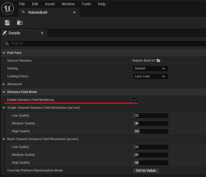 フォントフェイスアセットを開き、下部のEnable Distance Field Renderingにチェックを入れます。