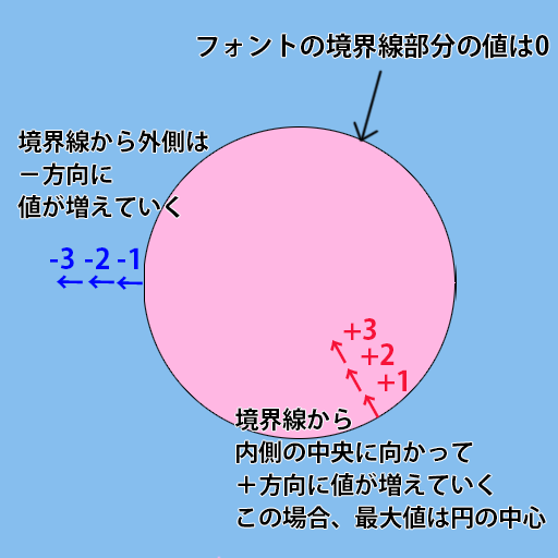 SDFはフォントの内側が+の値、外側が負の値を持ちます。以下の様なイメージです。