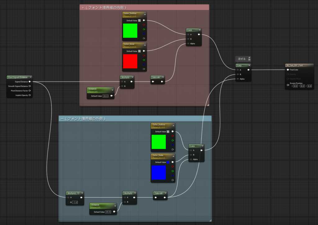 このグラデデーションはフォントの内側は0となる(Staurationをかけた後の値)ので、内側の赤色~緑のグラデーションを混ぜるためのアルファとしても使います。