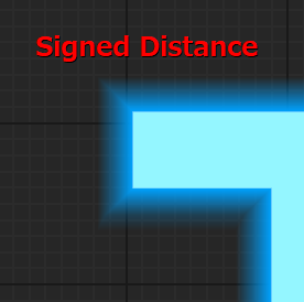 Signed Distanceのピンから上記の画像で説明したフォントの境界線から内側に向かうほど+に増えていく数値、