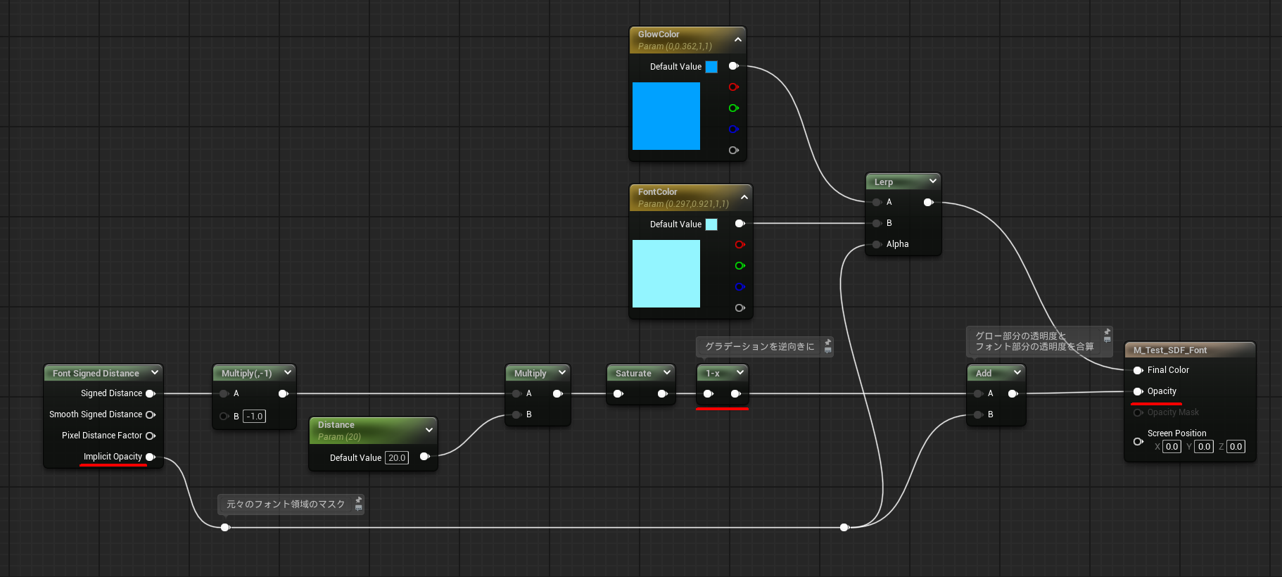 そしてFont Signed Distanceにはフォント元々の領域のアルファを出してくれるImplicit Opacityという便利なピンがあります。