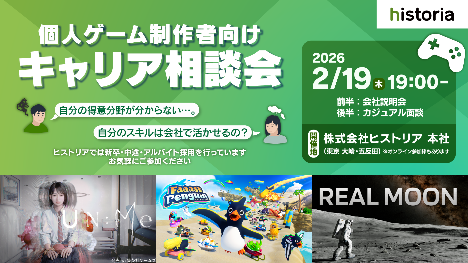 弊社の採用活動の一環ではありますが、スキルの活かし方やキャリアについて悩む機会が多いと思われる個人ゲーム制作者の皆さまに、気軽に相談できる場を提供できればと考え企画しました。