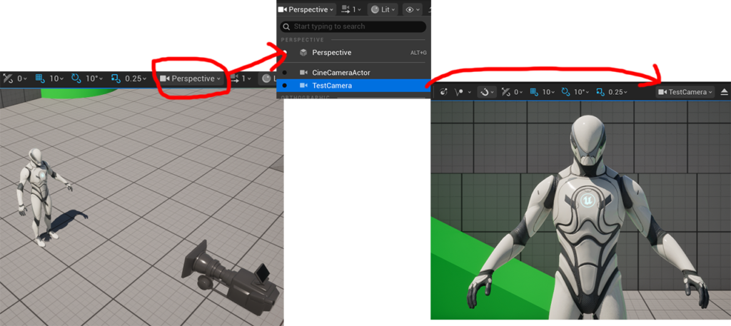 ※画面左側が置いただけの状態、右側が選択しているカメラをPerspectiveから任意(今回はTestCamera)のカメラを選んだ状態