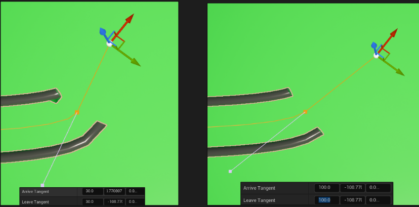 ハンドルの長さは回転等の数値の下のArrive TangentとLeave Tangentの調整できます。