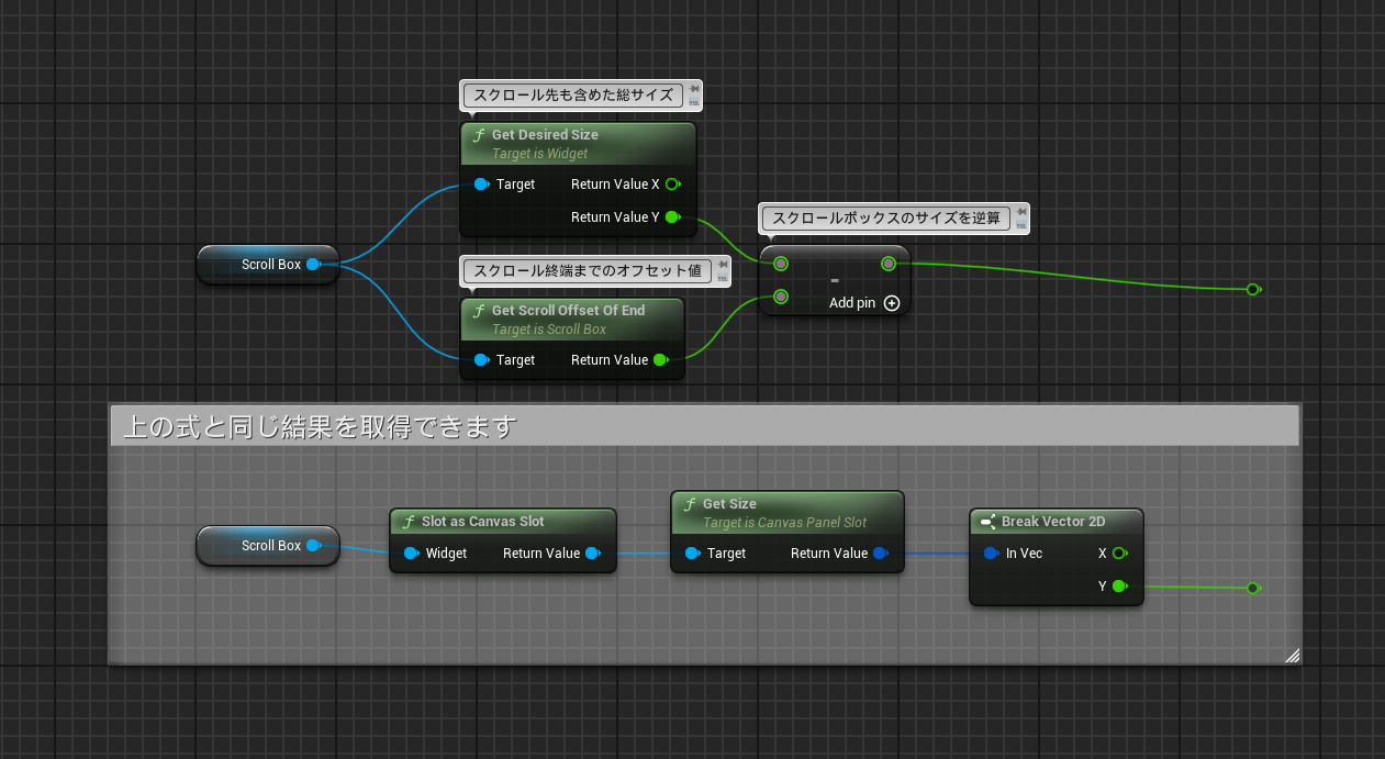 紹介したサンプルではスクロールボックスの大きさを[Get Desired Size] – [Get Scroll Offset Of End]で計算しているのですが、実はこれを使わずともスクロールボックスの大きさを取得する方法が存在します。