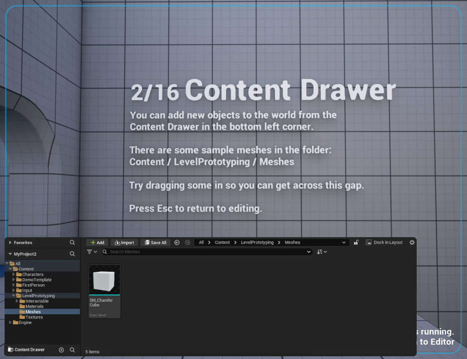 2/16 Content Drawer There are some sample meshes in the folder: Try dragging some in so you can get across this gap. |
