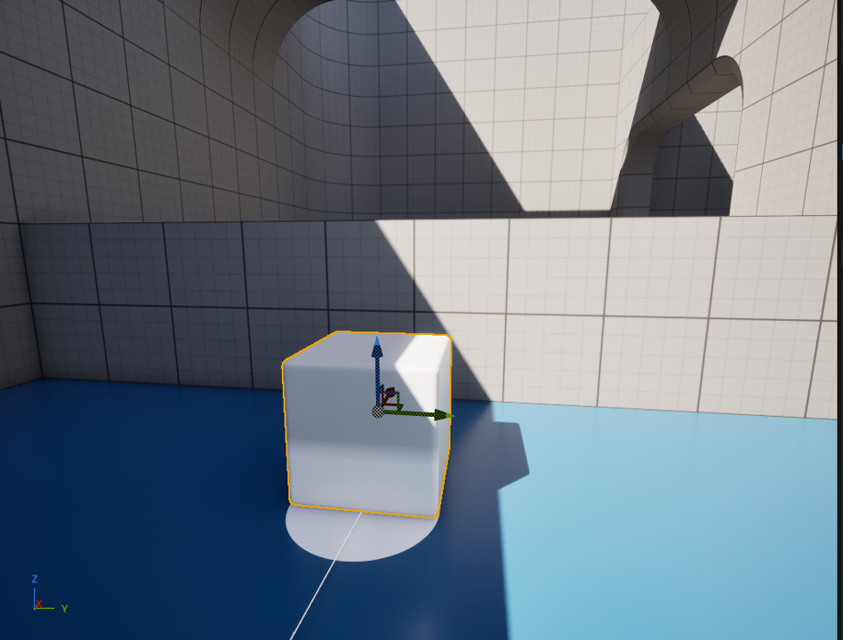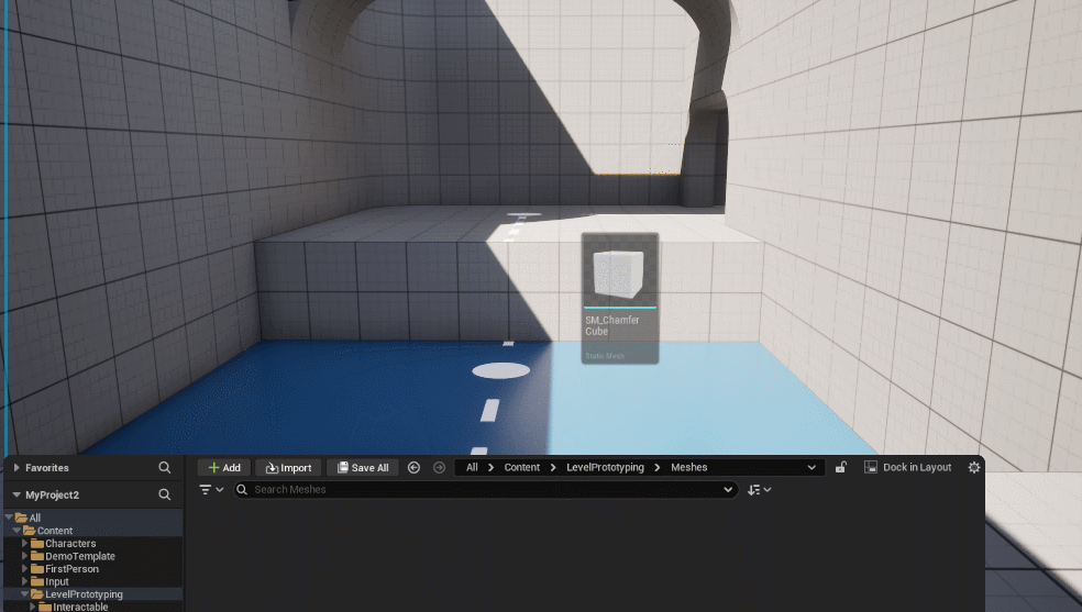 道なりに進んで見ると先に行けないようになっていました!編集モードでContent / LevelPrototyping / Meshesにあるサンプルメッシュを置いてみましょう。