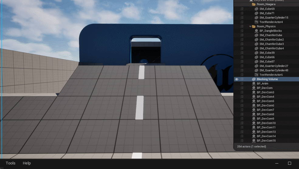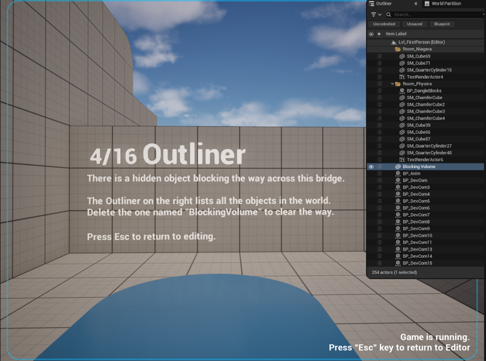 4/16 Outliner There is a hidden object blocking the way across this bridge. The Outliner on the right lists all the objects in the world. Press Esc to return to editing. |